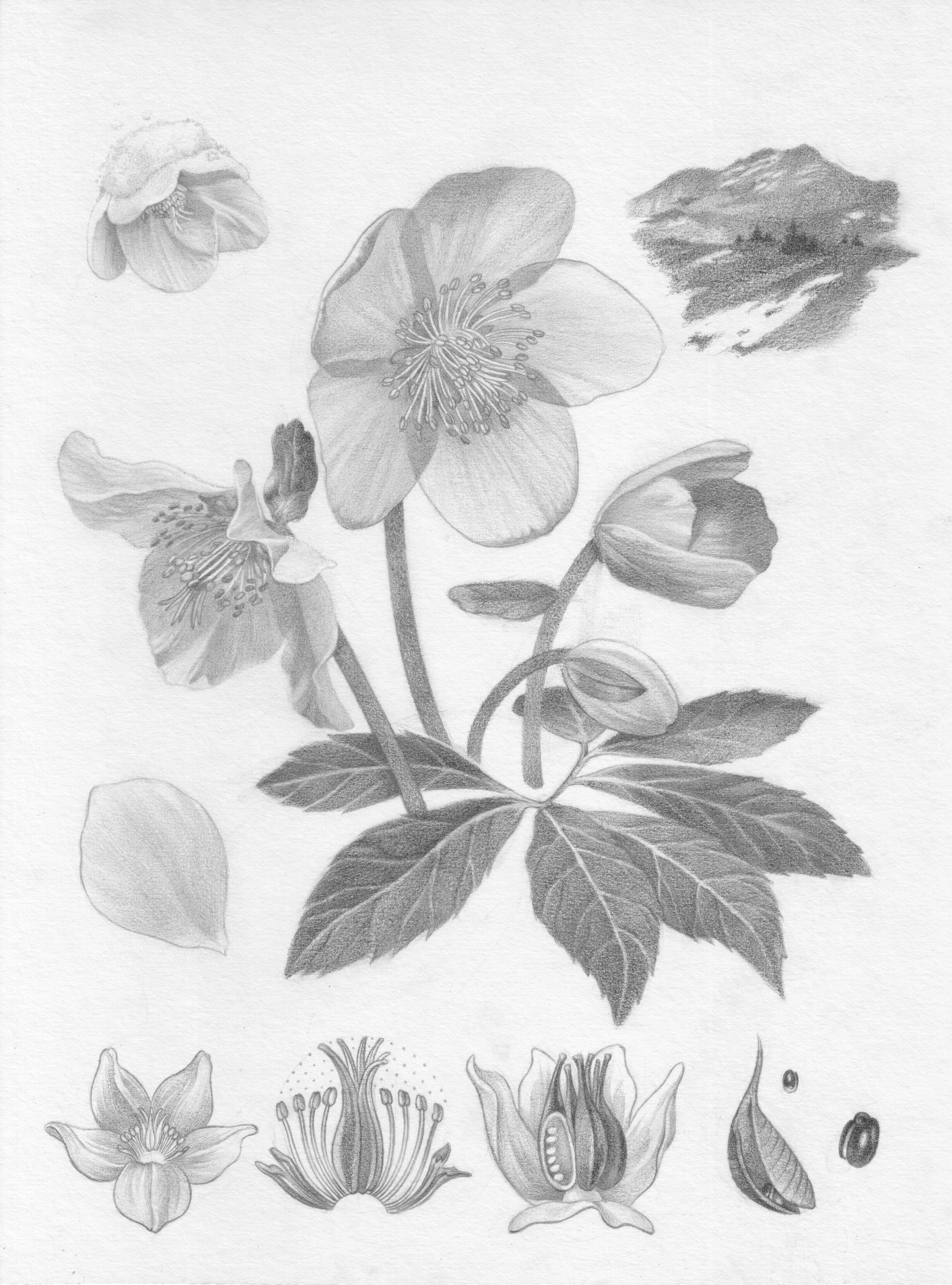 I like this hood made of snow so much :—) I made my first proper botanical drawing telling about the Christmas rose. I just adore flowers growing through the snow and surviving winter alongside.